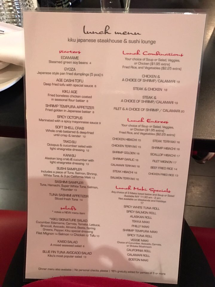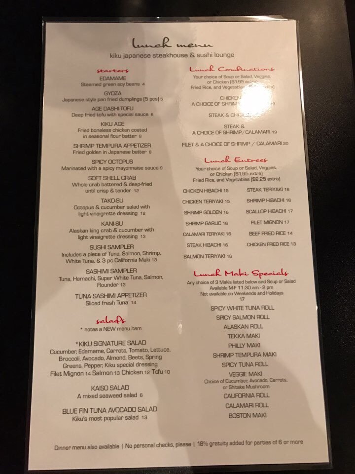 Kiku Japanese Steak House & Sushi Lounge Menu